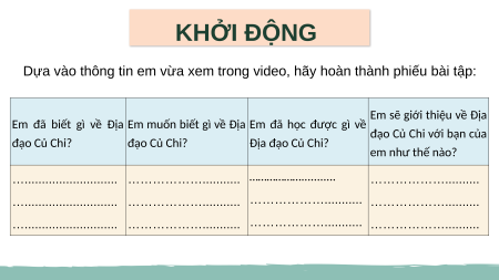 Em đã biết gì về Địa Em muốn biết gì về Địa Em đã học được gì về đạo Củ Chi với bạn của đạo Củ Chi? đạo Củ Chi? Địa đạo Củ Chi? em như thế nào?