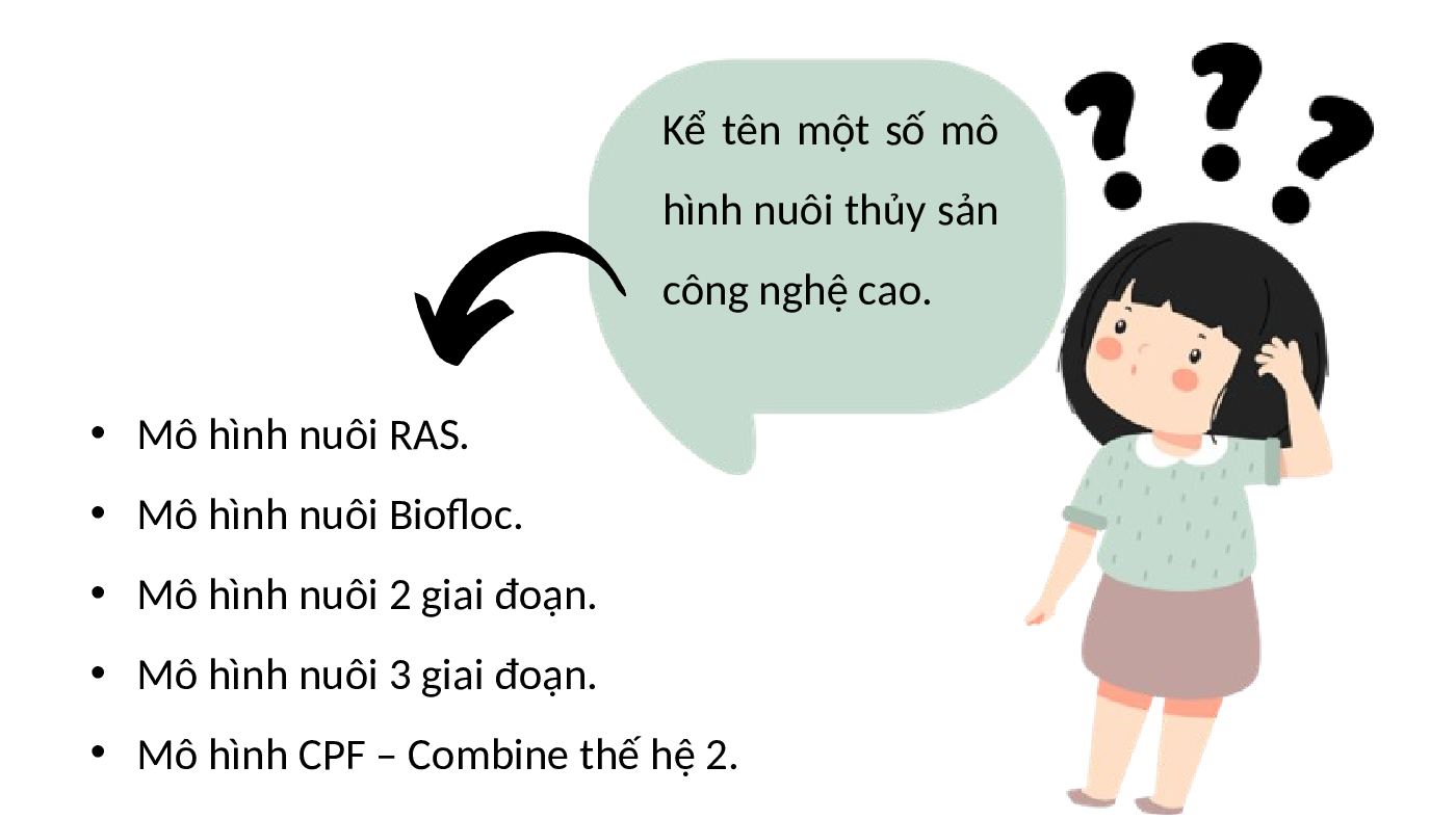 Quan sát video và trả lời câu hỏi: Kể tên một số mô hình nuôi thủy sản công nghệ cao. • Mô hình nuôi RAS. • Mô hình nuôi Biofloc.