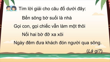 Ngày đêm đưa khách đón người qua sông. (Là gì?) Đáp án: con thuyền