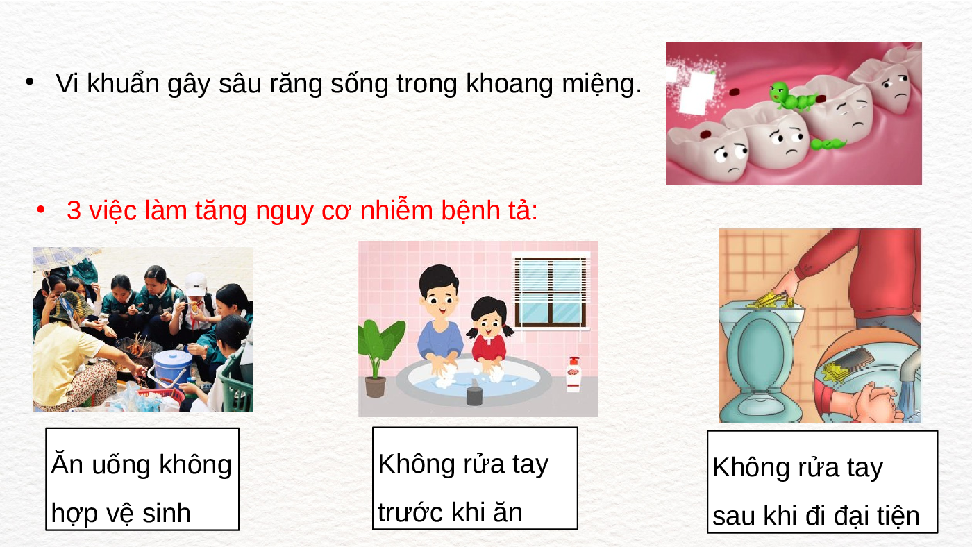 • 3 việc làm tăng nguy cơ nhiễm bệnh tả: Ăn uống không Không rửa tay Không rửa tay hợp vệ sinh trước khi ăn sau khi đi đại tiện