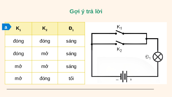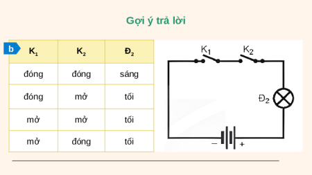(sáng/tối) khi các khóa K1 và K2 đóng/mở. Hình 21.1 Gợi ý trả lời a K K Đ 1 2 1 đóng đóng sáng đóng mở sáng mở mở sáng mở đóng tối