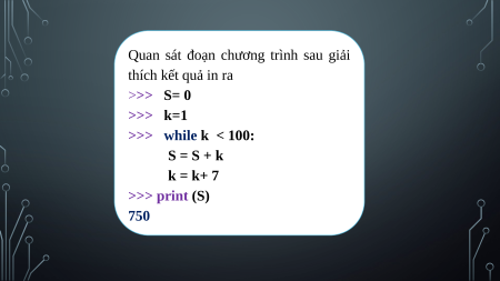 Quan sát đoạn chương trình sau giải thích kết quả in ra >>> S= 0 >>> k=1 >>> while k < 100: S = S + k k = k+ 7 >>> print (S) 750 1. LỆNH WHILE