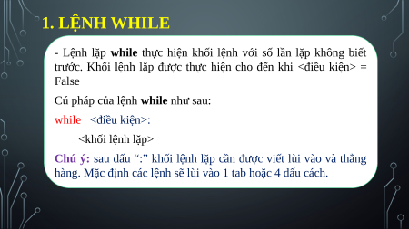 - Lệnh lặp while thực hiện khối lệnh với số lần lặp không biết