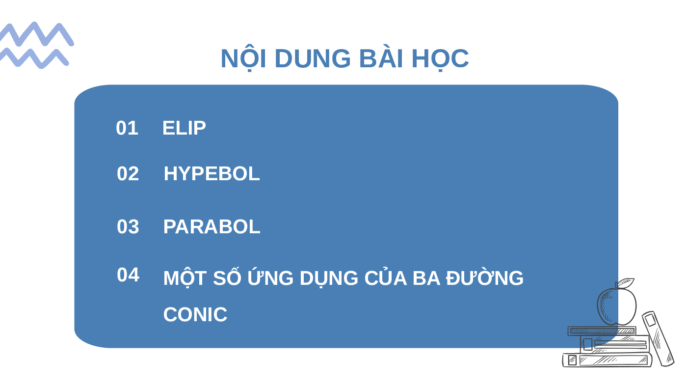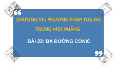 BÀI 22: BA ĐƯỜNG CONIC NỘI DUNG BÀI HỌC 01 ELIP 02 HYPEBOL 03 PARABOL 04