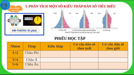 I. PHÂN TÍCH MỘT SỐ KIỂU THÁP DÂN SỐ TIÊU BIỂU Hình thành kiến thức HĐ NHÓM: 05 phút PHIẾU HỌC TẬP Cơ cấu dân số Cơ cấu dân số Nhóm Tháp Kiểu tháp theo tuổi theo giới 1+2 Châu Phi 3+4 Châu Á 5+6 Châu Âu