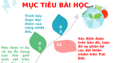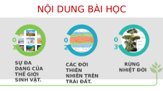 Sự đa dạng về giống loài. NỘI DUNG BÀI HỌC 0 0 0 1 2 3 SỰ ĐA CÁC ĐỚI RỪNG DẠNG CỦA THIÊN NHIỆT ĐỚI THẾ GIỚI NHIÊN TRÊN SINH VẬT. TRÁI ĐẤT. MỤC TIÊU BÀI HỌC Trình bày được đặc điểm của rừng nhiệt 0 Cont đới. 0 ent Here 3 3 Xác định được 0 02