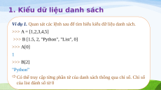 Ví dụ 1. Quan sát các lệnh sau để tìm hiểu kiểu dữ liệu danh sách. >>> A = [1,2,3,4,5]