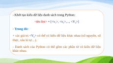 - Danh sách của Python có thể gồm các phần tử có kiểu dữ liệu