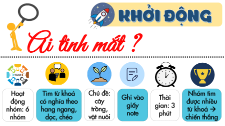 KHỞI ĐỘNG Ai tinh mắt ? Hoạt Tìm từ khoá Chủ đề: Nhóm tìm động có nghĩa theo Ghi vào Thời cây được nhiều nhóm: 6 hang ngang, giấy gian: 3 trồng, từ khoá → nhóm dọc, chéo note phút vật nuôi chiến thắng B Q U Ả T G N G Ã V N K