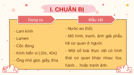 CƠ THỂ ĐƠN BÀO, CƠ THỂ ĐA BÀO. NỘI DUNG BÀI HỌC I. CHUẨN BỊ II. CÁCH TIẾN HÀNH III. THU HOẠCH