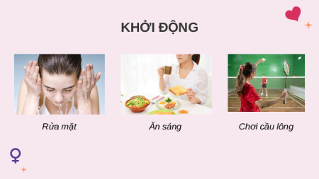 việc gì để chăm sóc, bảo vệ sức khỏe của bản thân? KHỞI ĐỘNG Rửa mặt Ăn sáng Chơi cầu lông