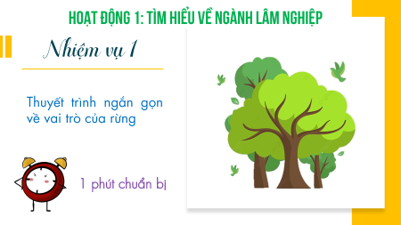 HOẠT ĐỘNG 1: TÌM HIỂU VỀ NGÀNH LÂM NGHIỆP Nhiệm vụ 1 Thuyết trình ngắn gọn về vai trò của rừng 1 phút chuẩn bị