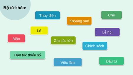 không dùng ngoại ngữ, từ đồng nghĩa và trái nghĩa để diễn tả. Bộ từ khóa: Thủy điện Chè Khoáng sản Lê Lễ hội Mận Gia súc lớn Chính sách Dân tộc thiểu số Việc làm Đầu tư