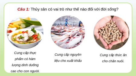 Câu 1: Thủy sản có vai trò như thế nào đối với đời sống? Cung cấp thực Cung cấp nguyên Cung cấp thức ăn phẩm có hàm