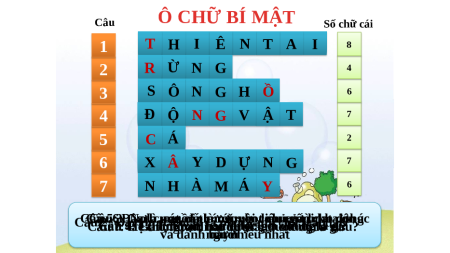 nhiên ở địa phương em? Câu Ô CHỮ BÍ MẬT Số chữ cái 1 T H I Ê N T A I 8 2 R Ừ N G 4 3 S Ô N G H Ồ 6 4 Đ Ộ N G V Ậ T 7 5 C Á 2 6 X Â Y D Ự N G 7 7 N H À M Á Y 6 C C â âC u u â 6 5 u : : 3 G Đ : ạc ây N h, ơi c là c u át, ngu ng đá ồn c ấplà ng thức uyê ăn nước n bị ngọ li ct ệ c u on c hủ ủa ngư yế hoạ ời u c t kh ho đ c ộng ai on thác C C â â u u 2 C 7 : â : Đ u H 4 ệ ây : th G ống được g ấu, h x ư ử ọi ơulí là , nước lá nai đ phổưth i ải x ợc được anh củ gọi ch đ a tặt r ung ở ái là đâu? đất?