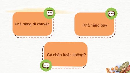 Làm thế nào để em có thể phân biệt được các loài sinh vật trên? Khả năng di chuyển Khả năng bay Có chân hoặc không?