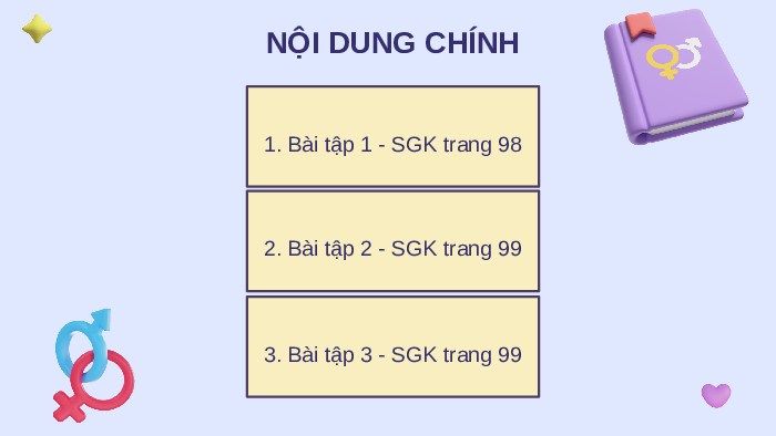 BÀI 27: ÔN TẬP CHỦ ĐỀ CON NGƯỜI VÀ SỨC KHỎE NỘI DUNG CHÍNH 1. Bài tập 1 - SGK trang 98 2. Bài tập 2 - SGK trang 99 3. Bài tập 3 - SGK trang 99