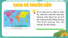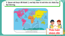 2. Quan sát lược đồ hình 2, em hãy tìm và nói tên các châu lục, đại dương. Thảo luận nhóm đôi