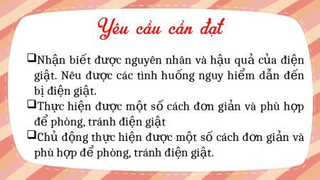 Thứ…ngày…tháng…năm…. Lê Thị Oanh Nh n ậ bi t ế đư c ợ nguyên nhân và h u ậ qu ả c a ủ đi n ệ gi t ậ . Nêu đư c ợ các tình hu n ố g nguy hi m ể d n ẫ đ n ế bị điện giật. Th c ự hi n ệ đ c ượ m t ộ s ố cách đ n ơ gi n ả và phù h p ợ để phòng, tránh đi n ệ gi t ậ Ch ủ đ n ộ g th c ự hi n ệ đư c ợ m t ộ s ố cách đ n ơ gi n ả và phù h p đ ợ phòn ể g, tránh đi n ệ gi t ậ .