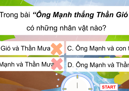 Trong bài “Ông Mạnh thắng Thần Gió”, có những nhân vật nào? Gió và Thần Mưa C. Ông Mạnh và con trai Mạnh và Thần Mưa D. Ông Mạnh và Thần START