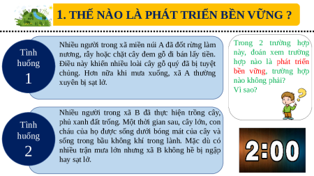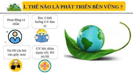 1. THẾ NÀO LÀ PHÁT TRIỂN BỀN VỮNG ? Đọc 2 tình Hoạt động cá huống GV đưa nhân ra GV bốc thăm Trả lời câu hỏi (quay số) HS vào giấy note trả lời