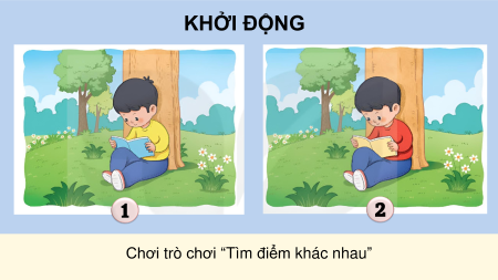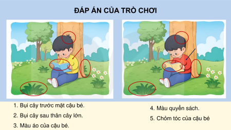 1. Bụi cây trước mặt cậu bé. 4. Màu quyển sách.