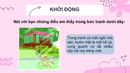 sàn, trước mặt là một hồ cá, xung quanh có rất nhiều cây cối rợp bóng mát. CHỦ ĐỀ 13 BÀI 3 CHÁU THĂM NHÀ BÁC Tiết 1, 2 CHÁU THĂM NHÀ BÁC
