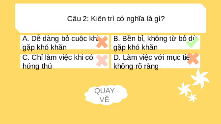 Câu 2: Kiên trì có nghĩa là gì? A. Dễ dàng bỏ cuộc khi