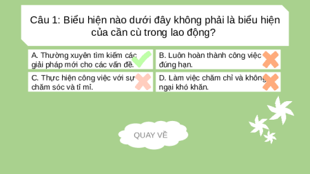 D. Làm việc chăm chỉ và không chăm sóc và tỉ mỉ. ngại khó khăn. QUAY VỀ