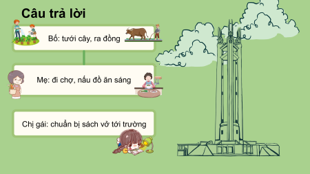 ngày mới của mỗi người trong gia đình. Câu trả lời Bố: tưới cây, ra đồng