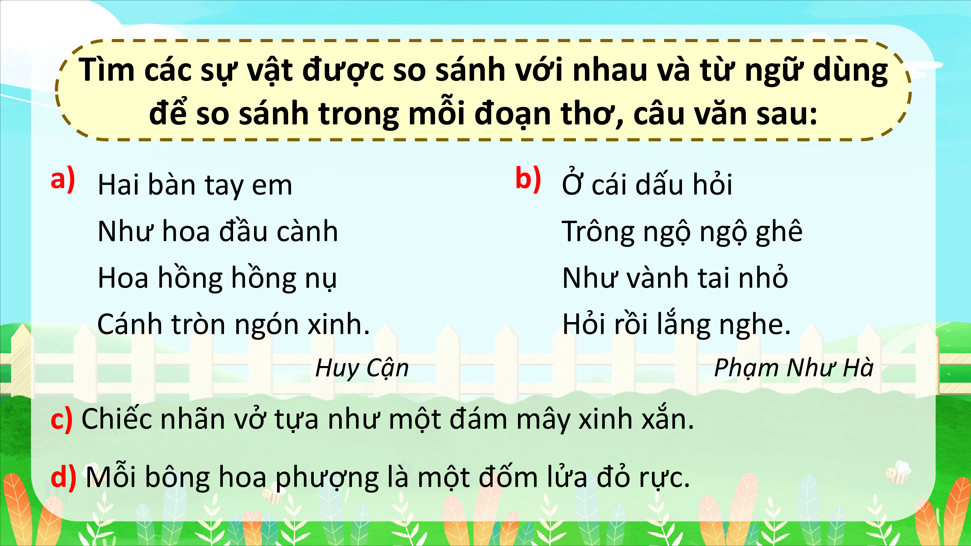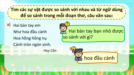 để so sánh trong mỗi đoạn thơ, câu văn sau: a) Hai bàn tay em b) Ở cái dấu hỏi Như hoa đầu cành Trông ngộ ngộ ghê Hoa hồng hồng nụ Như vành tai nhỏ Cánh tròn ngón xinh. Hỏi rồi lắng nghe. Huy Cận Phạm Như Hà