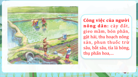 nông dân: cày đất, gieo mầm, bón phân, gặt hái, thu hoạch nông sản, phun thuốc trừ