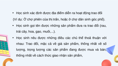 • Học sinh gọi tên được những sản phẩm đưa ra trao đổi (rau,