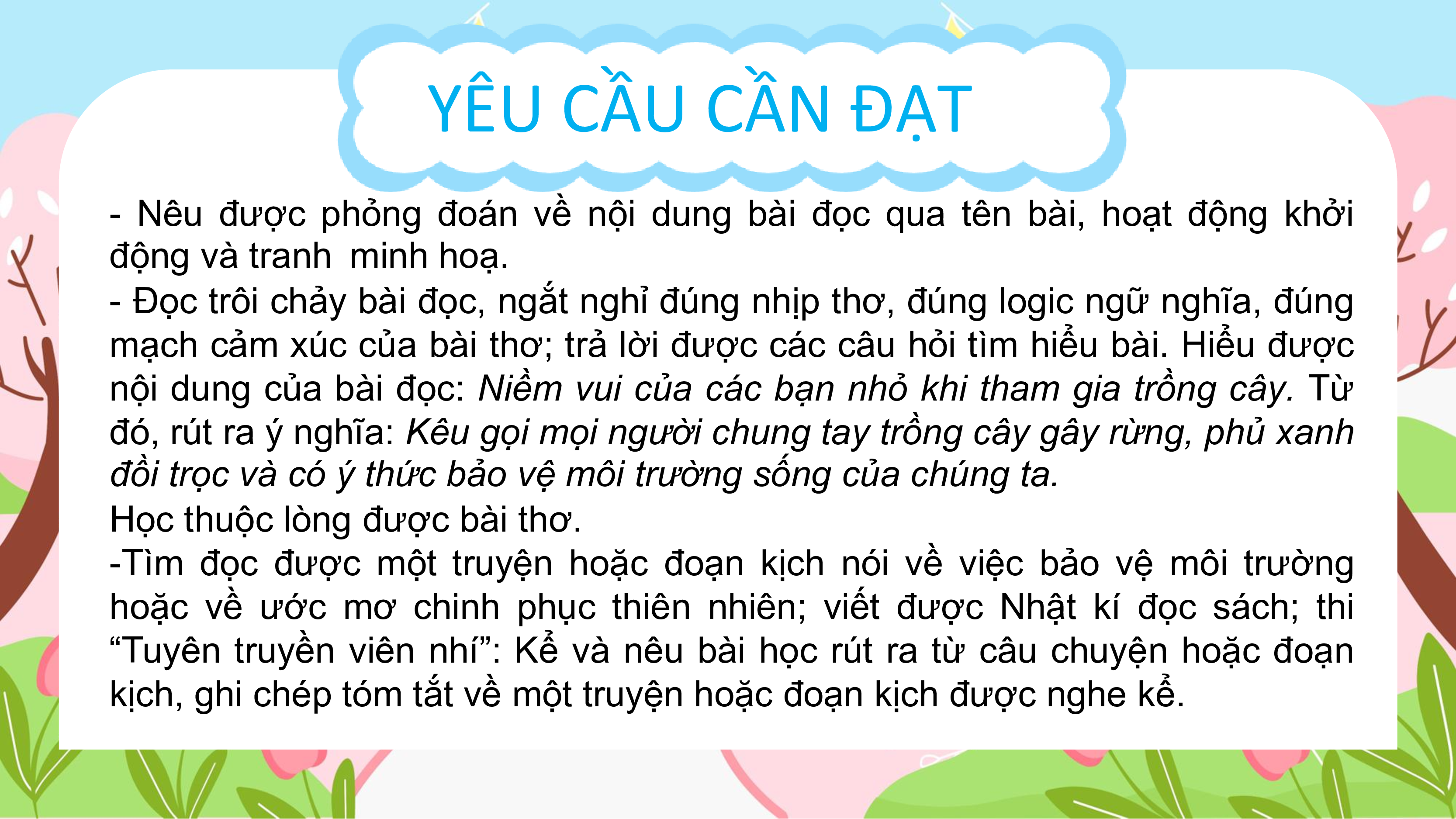 nội dung của bài đọc: Niềm vui của các bạn nhỏ khi tham gia trồng cây. Từ