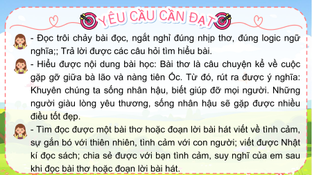 - Đọc trôi chảy bài đọc, ngắt nghỉ đúng nhịp thơ, đúng logic ngữ