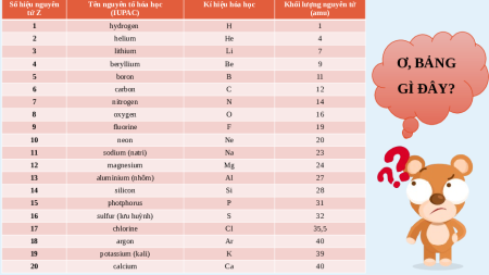 Khối lượng nguyên tử tử Z (IUPAC) (amu) 1 hydrogen H 1 2 helium He 4 3 lithium Li 7 4 beryllium Be 9 Ơ, BẢNG 5 boron B 11 6 carbon C 12 GÌ ĐÂY? 7 nitrogen N 14 8 oxygen O 16 9 fluorine F 19 10 neon Ne 20 11 sodium (natri) Na 23 12 magnesium Mg 24 13 aluminium (nhôm) Al 27 14 silicon Si 28 15 photphorus P 31 16 sulfur (lưu huỳnh) S 32 17 chlorine Cl 35,5 18 argon Ar 40 19 potassium (kali) K 39 20 calcium Ca 40