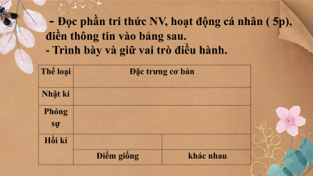 - Trình bày và giữ vai trò điều hành. Thể loại Đặc trưng cơ bản Nhật kí Phóng sự Hồi kí Điểm giống khác nhau