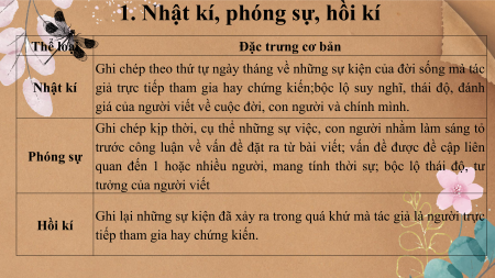 1. Nhật kí, phóng sự, hồi kí Thể loại Đặc trưng cơ bản