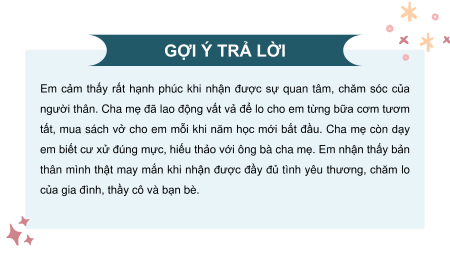 cảm xúc của em khi nhận được sự quan tâm, chăm sóc của người thân. GỢI Ý TRẢ LỜI