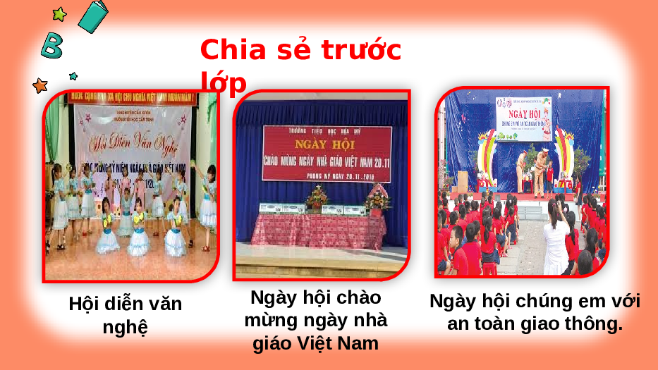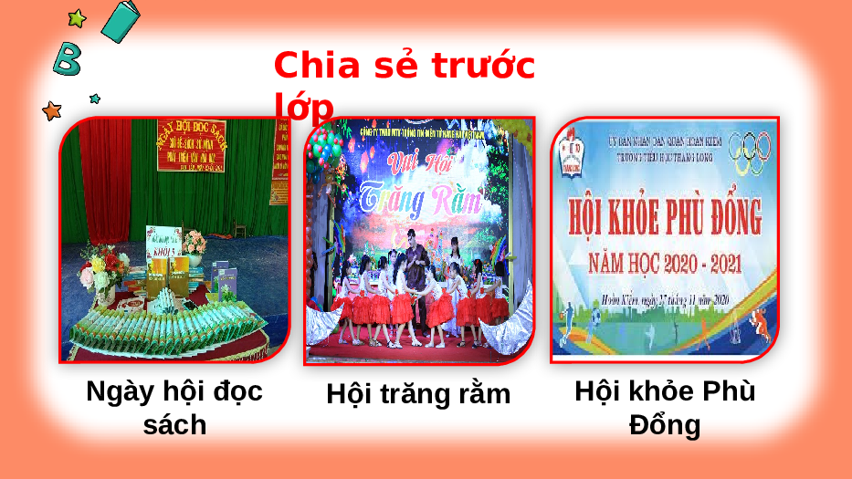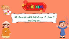 Kể tên một số lễ hội được tổ chức ở trường em. Chia sẻ trước lớp Ngày hội đọc Hội trăng rằm Hội khỏe Phù sách Đổng