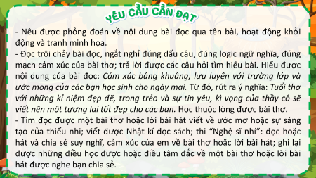 - Nêu được phỏng đoán về nội dung bài đọc qua tên bài, hoạt động khởi động và tranh minh họa.