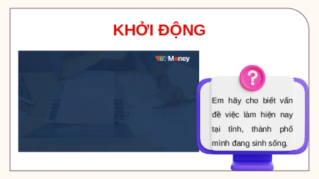 XIN CHÀO CHÀO MỪNG CÁC EM ĐẾN VỚI Việc làm BÀI HỌC MỚI! KHỞI ĐỘNG Em hãy cho biết vấn đề việc làm hiện nay tại tỉnh, thành phố mình đang sinh sống. Sinh viên ra trường thừa số lượng nhưng