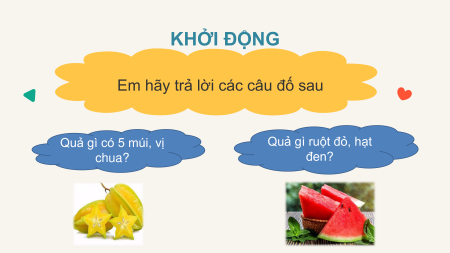 Em hãy trả lời các câu đố sau Quả gì có 5 múi, vị Quả gì ruột đỏ, hạt chua? đen? BÀI 3: TRÁI CHÍN