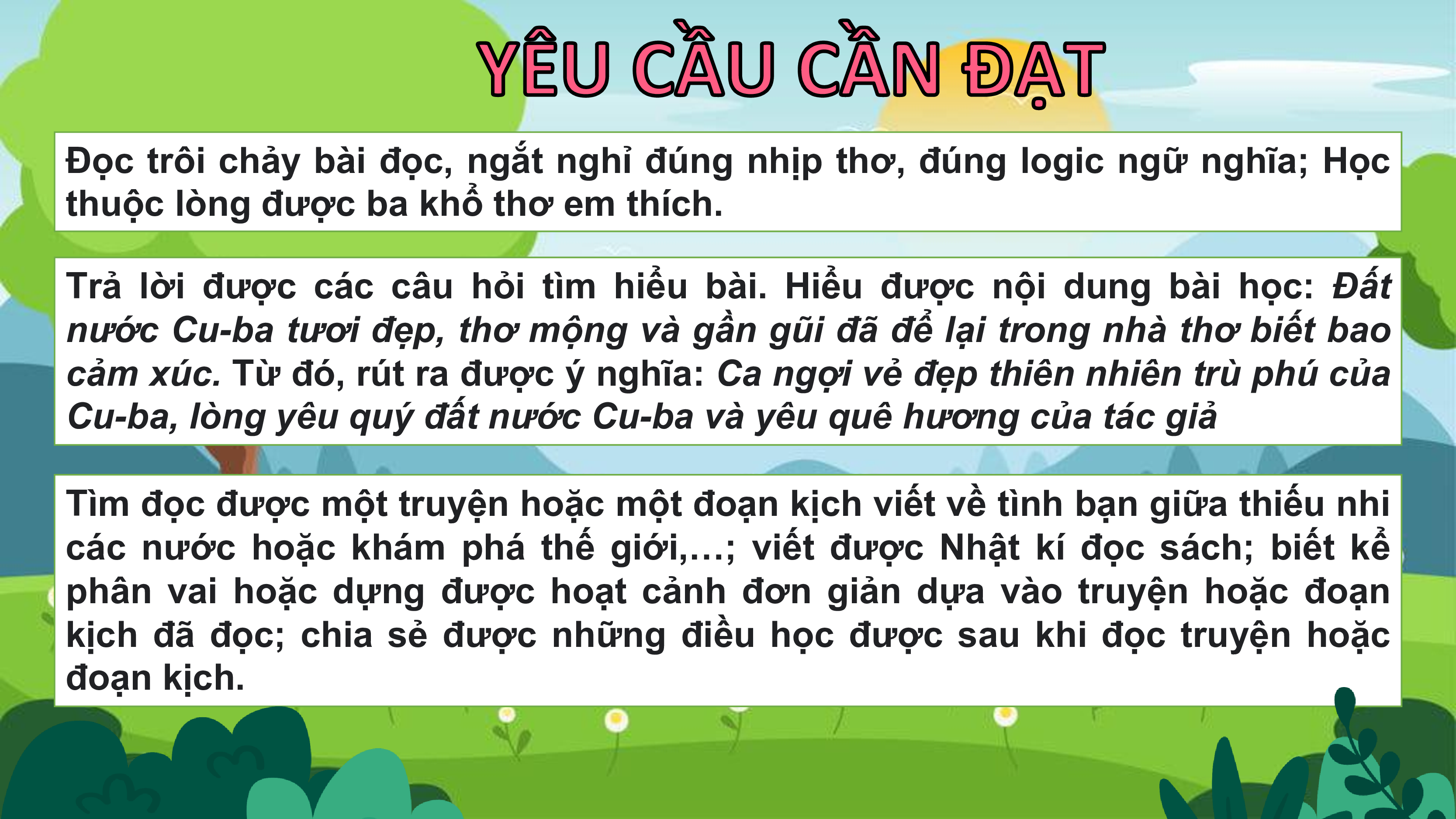 Đọc trôi chảy bài đọc, ngắt nghỉ đúng nhịp thơ, đúng logic ngữ nghĩa; Học
