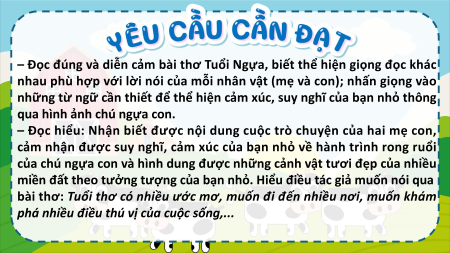 – Đọc đúng và diễn cảm bài thơ Tuổi Ngựa, biết thể hiện giọng đọc khác