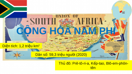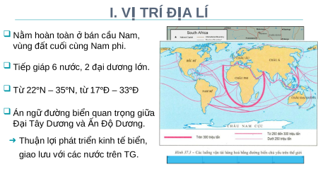 Đ A Ị LÍ 11 – K T Ế N I T Ố RI TH C Ứ PH N Ầ HAI: Đ A Ị LÍ KHU V C Ự VÀ QU C G Ố IA Gv: Tr n ầ Th ịHà CỘNG HÒA NAM PHI Diện tích: 1,2 tri u ệ km2 Dân s : ố 59,3 tri u ệ ngư i ờ (2020) Thủ đô: Prê-tô-ri-a, K p ế -tao, Blô-em-phôn- tên BÀI 30: VỊ TRÍ Đ A Ị LÍ, ĐI U Ề KI N Ệ T Ự NHIÊN, DÂN C Ư VÀ XÃ H I Ộ CỘNG HÒA NAM PHI I. V T Ị RÍ Đ A Ị LÍ N m ằ hoàn toàn ở bán c u ầ Nam, vùng đ t ấ cu i ố cùng Nam phi. Tiếp giáp 6 nư c ớ , 2 đ i ạ dư n ơ g l n ớ . Từ 22°N – 35°N, t ừ 17°Đ – 33°Đ Án ngữ đư n ờ g bi n ể quan tr n ọ g gi a ữ Đ i ạ Tây Dư n ơ g và n Ấ Đ ộ Dư n ơ g. ➜ Thuận l i ợ phát tri n ể kinh t ế bi n ể , giao lưu với các nư c ớ trên TG.
