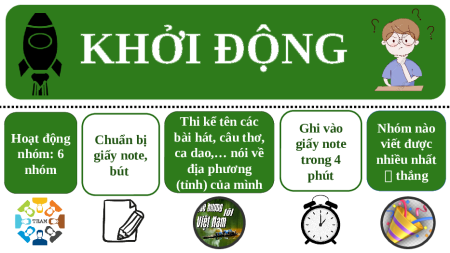 KHỞI ĐỘNG Thi kể tên các Ghi vào Nhóm nào Hoạt động Chuẩn bị bài hát, câu thơ, giấy note viết được nhóm: 6 giấy note, ca dao,… nói về trong 4 nhiều nhất nhóm bút địa phương phút thắng (tỉnh) của mình