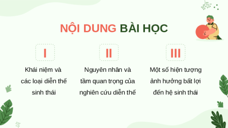 ĐẾN VỚI BÀI HỌC NGÀY HÔM NAY! KHỞI ĐỘNG Quá trình tự tái sinh của một khu rừng bị cháy rụi sẽ diễn ra như thế nào? BÀI 28 DIỄN THẾ SINH THÁI NỘI DUNG BÀI HỌC I II III Khái niệm và Nguyên nhân và Một số hiện tượng các loại diễn thế tầm quan trọng của ảnh hưởng bất lợi sinh thái nghiên cứu diễn thế đến hệ sinh thái