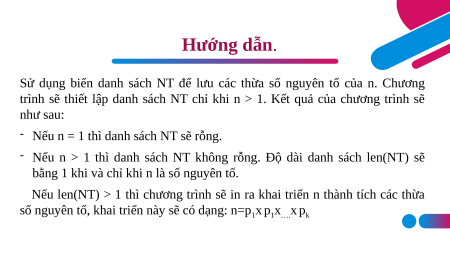 - Nếu n > 1 thì danh sách NT không rỗng. Độ dài danh sách len(NT) sẽ