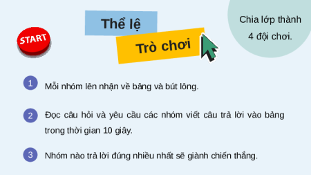 Đọc câu hỏi và yêu cầu các nhóm viết câu trả lời vào bảng trong thời gian 10 giây. 3